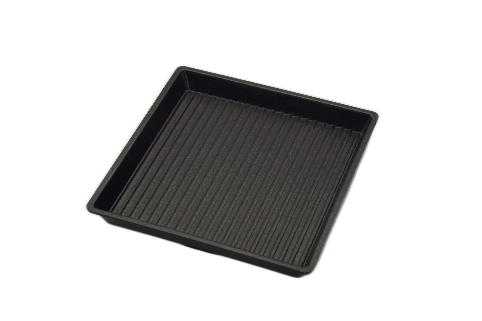 Patelnia kwadratowa o wymiarach 260x260mm jest pokryta teflonem więc produkt nie przywiera do niej i jest łatwa do czyszczenia. Dodatkowo posiada wzorki grillowe, więc jest w stanie wprowadzić „efekt grilla” na produkcie spożywczym pod warunkiem, że produkt odpowiednio długo miał kontakt z ryflami grill lub zanim został na nie położony, patelnia była wcześniej rozgrzana w komorze pieca przez kilka minut. Wtedy efekt grilla jest w pełni satysfakcjonujący.